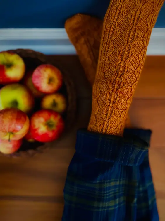 The Apple Cider Socks, with their crisp cabled texture that pours down the front of the socks, are inspired by one of my favorite autumnal drinks. These socks are worked from the cuff down with a repetitive cable motif, and the pattern includes instructions for working the cables both with and without a cable needle.