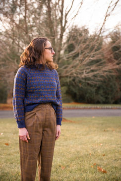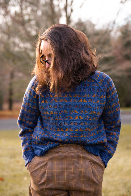 The Bookends Raglan is a cozy all-over colorwork sweater with a twist. The pattern is worked using slipped stitches in lieu of stranded colorwork so only one color is worked at a time. The sweater is worked from the top-down with a raglan construction and a comfy oversized fit.